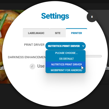 To print from Nutritics, please ensure that the Nutritics Print Driver has been selected as the ‘print driver’. The setting for this, depends on if you are printing from Label Magic or from the Orders Dashboard.