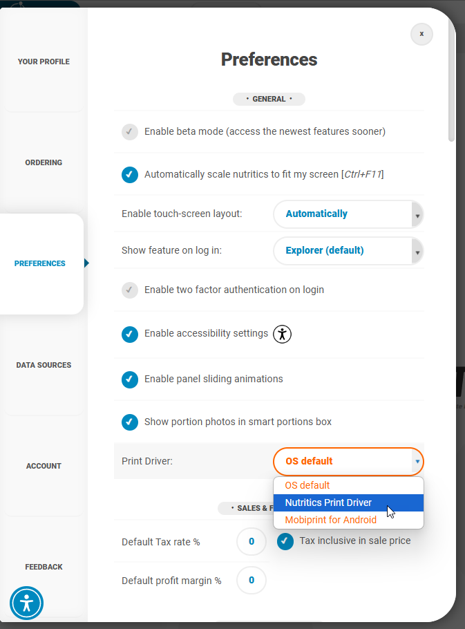 If printing dockets from the Orders dashboard, you can configure Nutritics to print with the Nutritics Print Driver from within the main settings area.